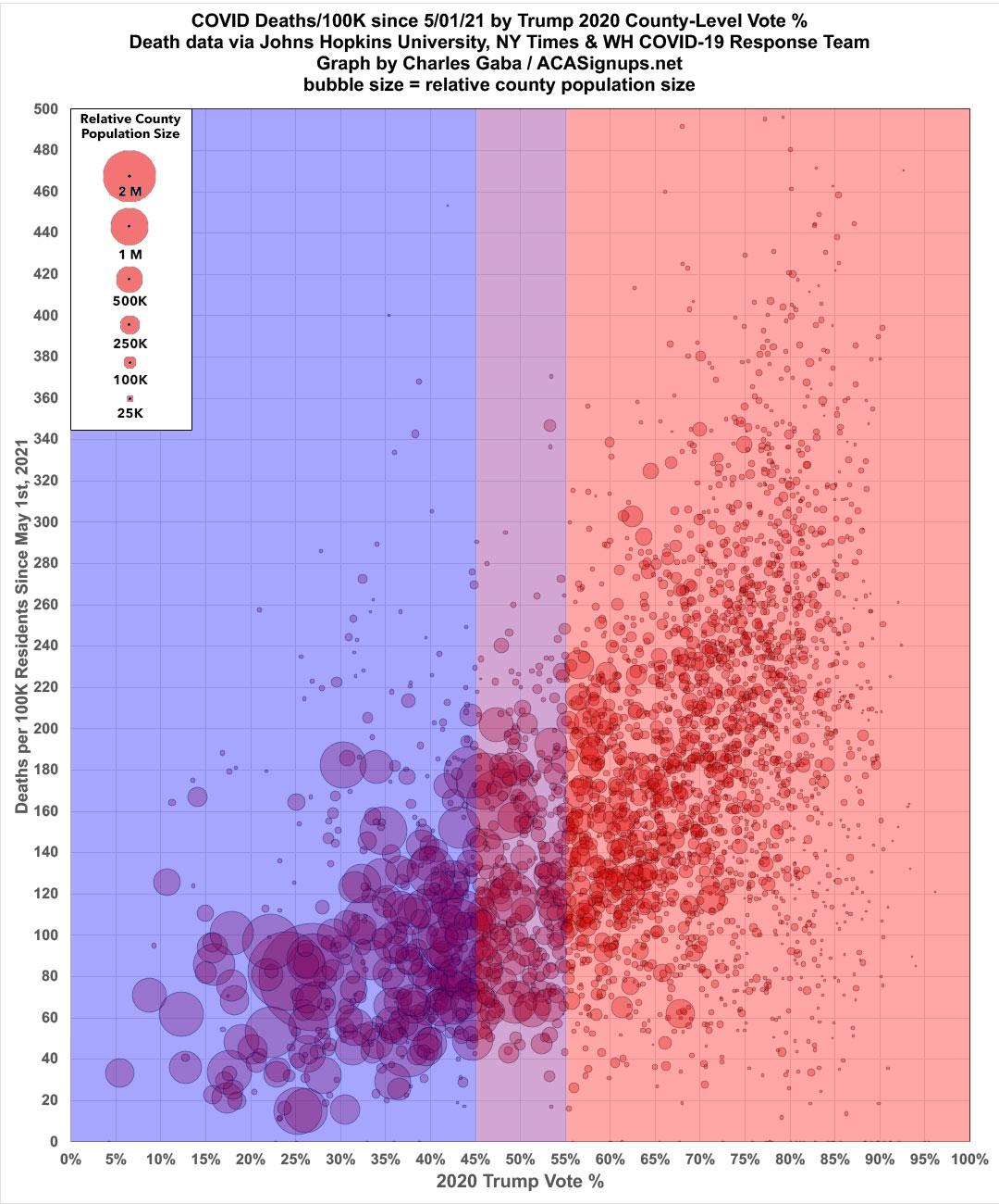 I've been posting weekly looks at the rate of COVID-19 cases & deaths at the county level since the point at which every U.S. adult could theoretically have received 2 COVID vaccination doses nearly a year ago, broken out by partisan lean (i.e, what percent of the vote Donald Trump received in 2020), as well as by the vaccination rate of each county in the U.S. (nonpartisan).