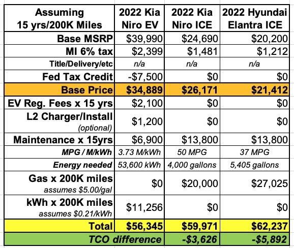 Over fifteen years & 200K miles, the total cost of ownership of the Niro EV is ~$3,600 lower than the $25K Niro ICE and ~$5,900 lower when compared to the $20K Elantra ICE. Again, if you don't include the L2 charger, the overall savings increases even more.