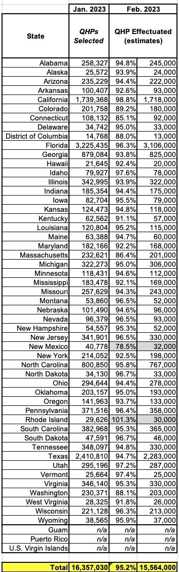 Here's where things get a bit weird, however. The February 2023 Effectuated Enrollment estimates in the new ASPE report rounds the state-level numbers off to the nearest 1,000...and the overall average is actually 95.2%, not 94%: