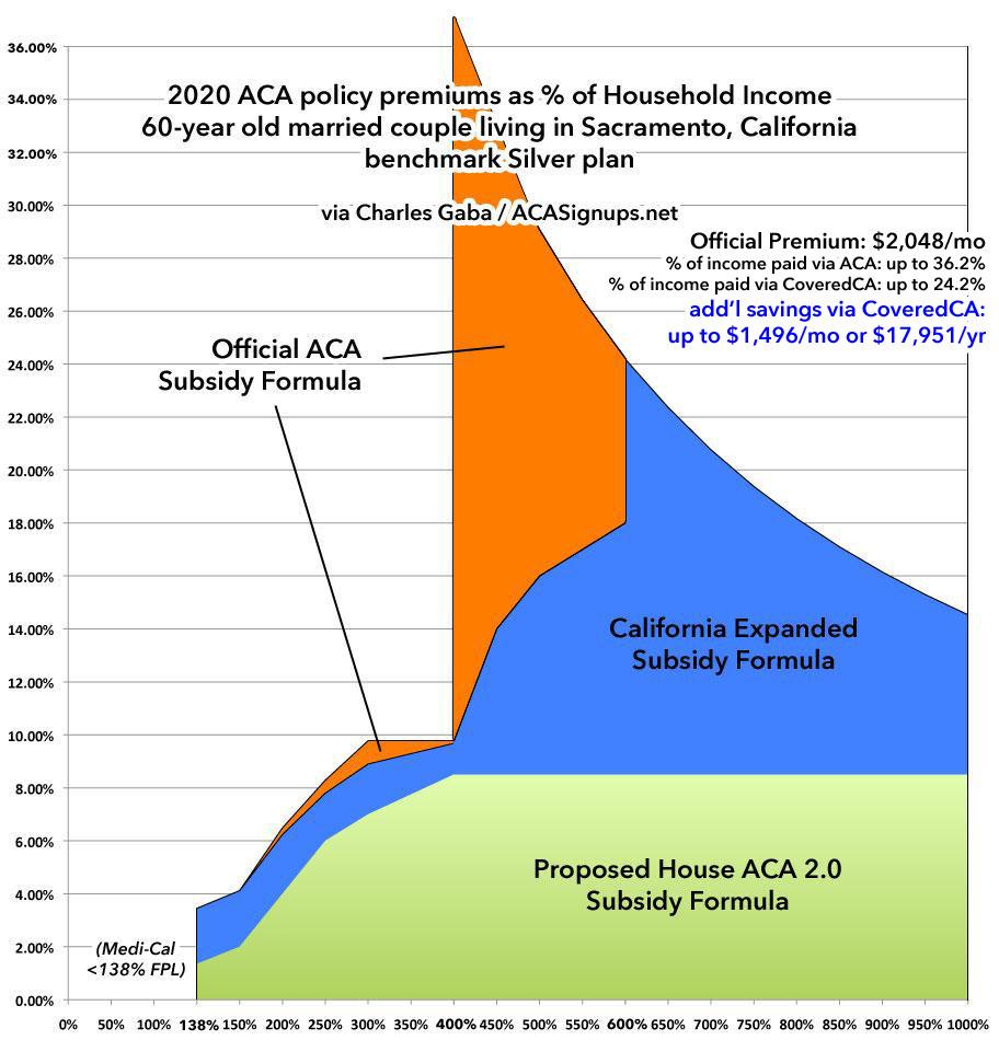 IMPORTANT: As I've noted before, Covered California has arranged to expand and enhance their ACA premium subsidies beyond the official ACA formula starting with the 2020 Open Enrollment Period. Back in October, I posted a detailed analysis, complete with tables and graphs to explain just how much hundreds of thousands of Californians could save under the new, beefed-up subsidy structure.