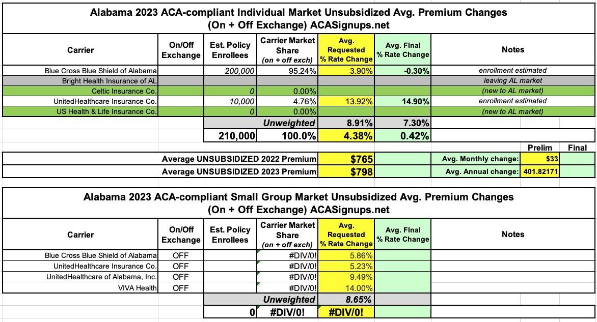 Alabama: Final Avg. unsubsidized 2023 #ACA rate changes: +0.4% (estimated)