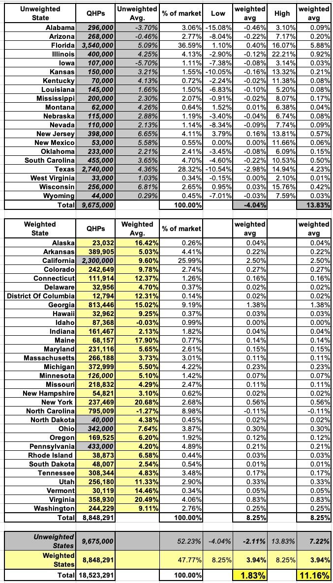 UPDATE: I decided to go the extra mile and see how wide the hypothetical range is for a fully weighted national average across all 50 states+DC by assuming 100% of all enrollees in the unweighted states were enrolled with carriers having the lowest and highest average 2024 rate changes. As you can see below, if you assume that the carriers with the lowest rate changes had 100% market share in those states, it would drop the weighted national average down to a 1.8% increase overall; if you assume the carriers with the highest rate changes had 100% market share, it would increase the weighted national average up to 11.2%.