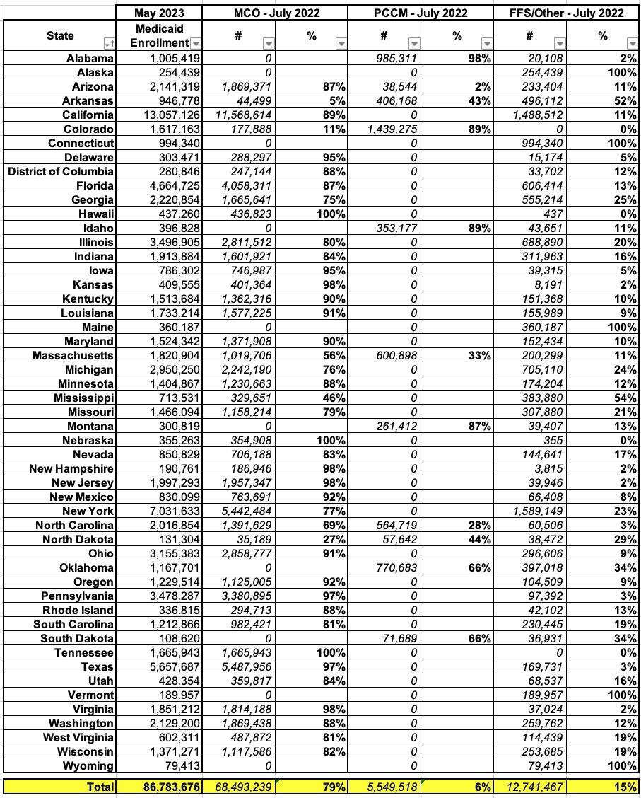 I then looked up the latest Medicaid enrollment report as of May 2023, just four months ago. This report breaks out both Medicare and CHIP (Childrens Health Insurance Program) enrollees for every state, as well as the combined totals. I don't know whether or not CHIP enrollees are handled the same way as Medicare (FFS, PCCM, MCO) in every state, so for my purposes I'm only including the ~86.8 million actual Medicaid enrollees.