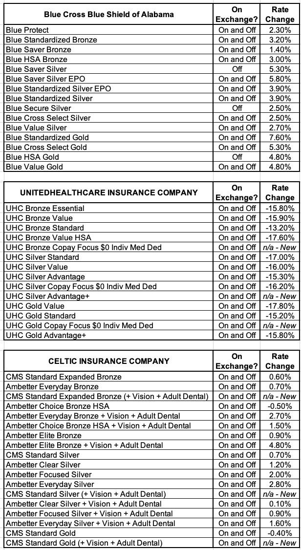 The Alabama Department of Insurance (ALDOI) has approved the final 2024 premium rates for the Affordable Care Act Individual Market in Alabama. The rates will be effective on January 1, 2024. The three carriers in the Alabama individual market are Blue Cross Blue Shield of Alabama (BCBS), UnitedHealthcare Insurance Company (UHC), and Celtic Insurance Company (CIC). On average, rates for BCBS increased 3.1 percent, rates for UHC decreased 15.1 percent, and rates for CIC increased 0.9 percent. The actual rates and the supporting material may be found by clicking on the links below.