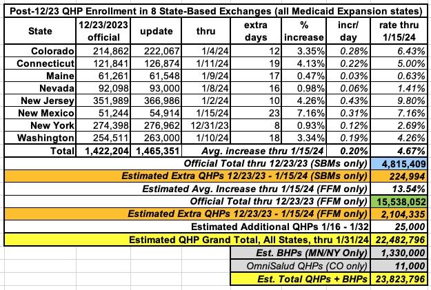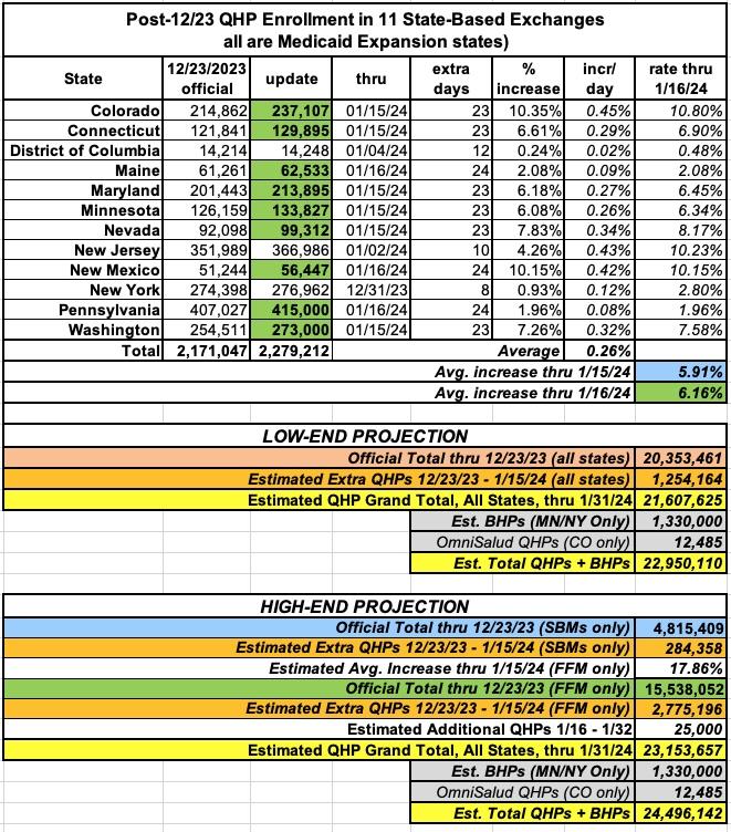 UPDATE 1/18/24: Whoa. Several more state-based exchanges have issued enrollment updates yesterday & today, including final numbers from Colorado, Maryland and Minnesota as well as a semi-final update out of Pennsylvania (which still has until Friday night before their deadline).