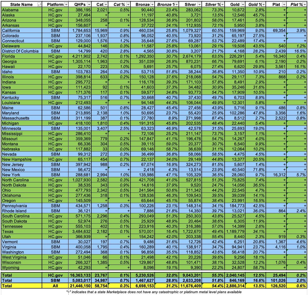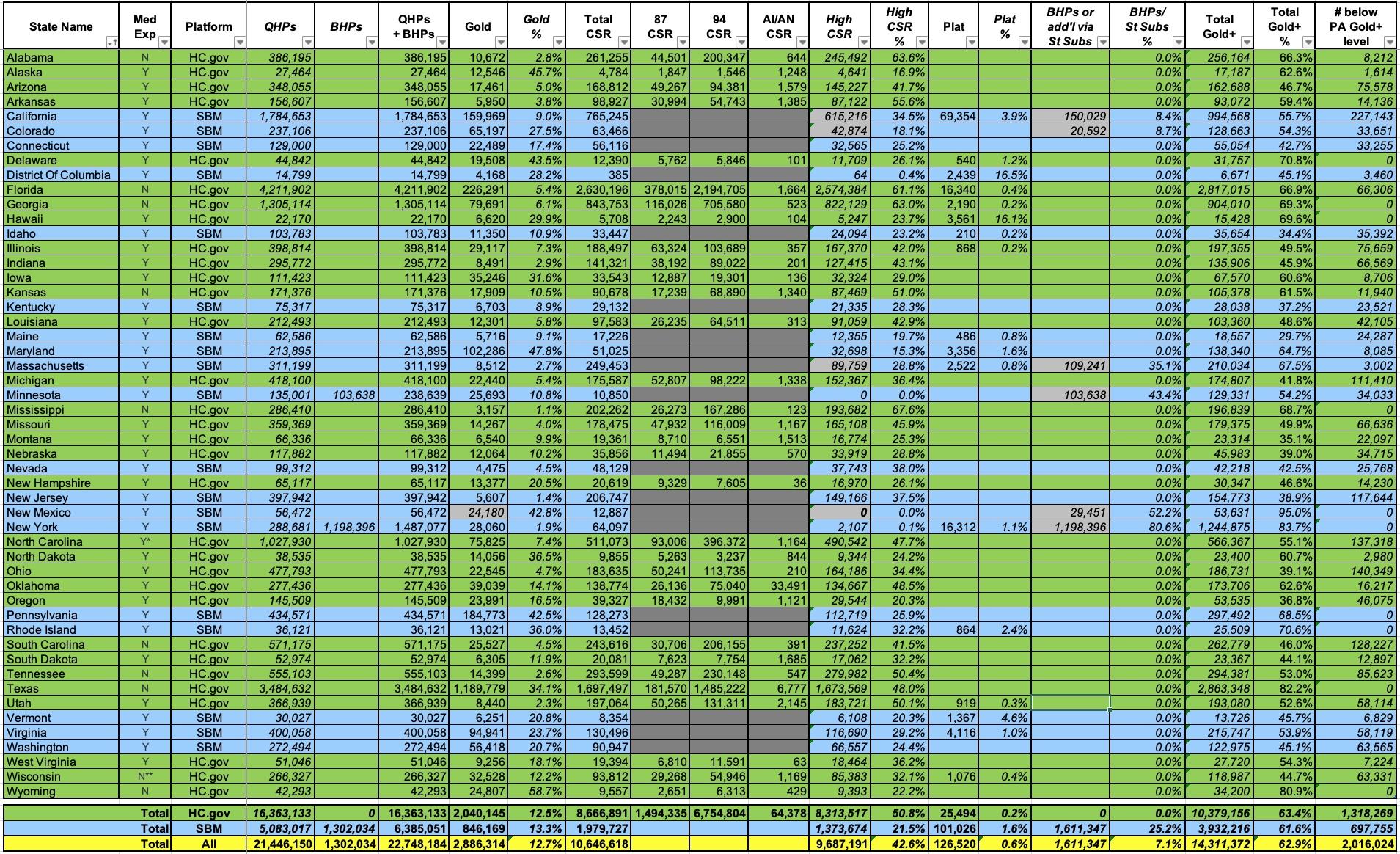 As for Vermont and Washington's supplemental subsidy programs, they mostly apply to premiums, not cost sharing, so while their Gold-or-Better numbers are likely slightly higher, I don't think it's more than a percent or two at most.