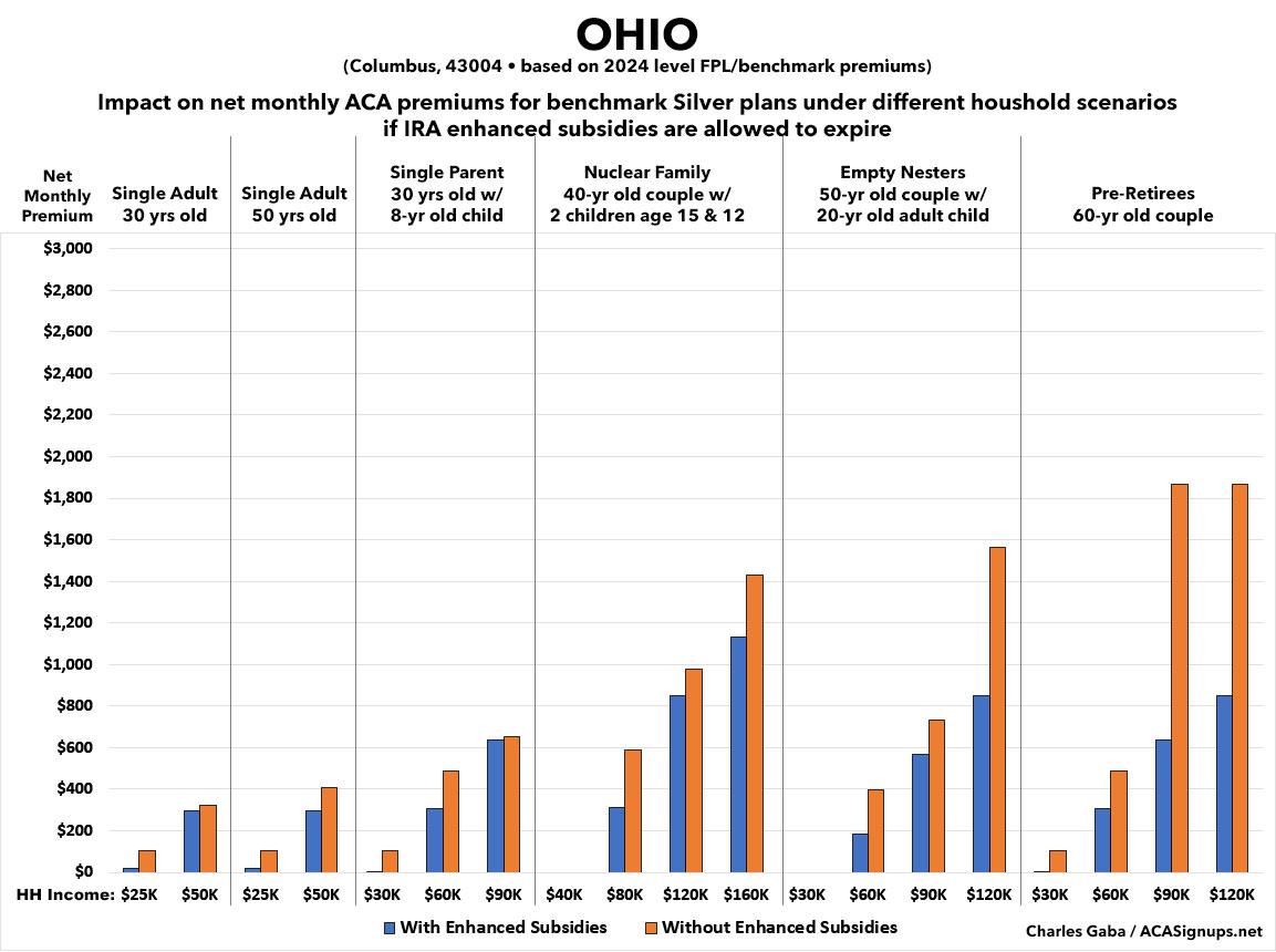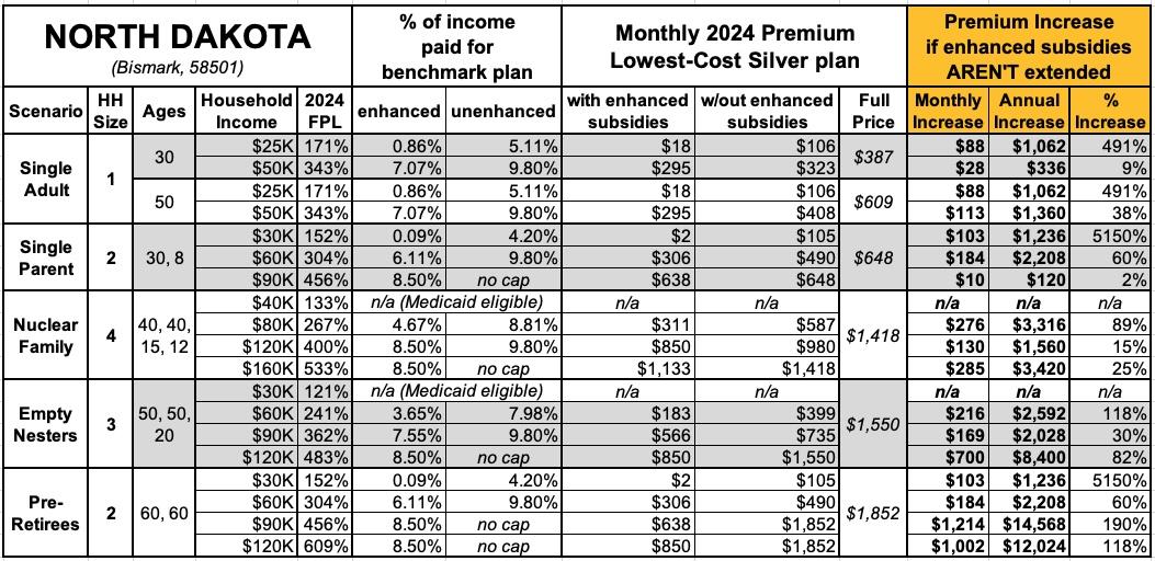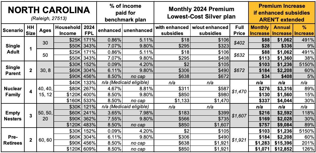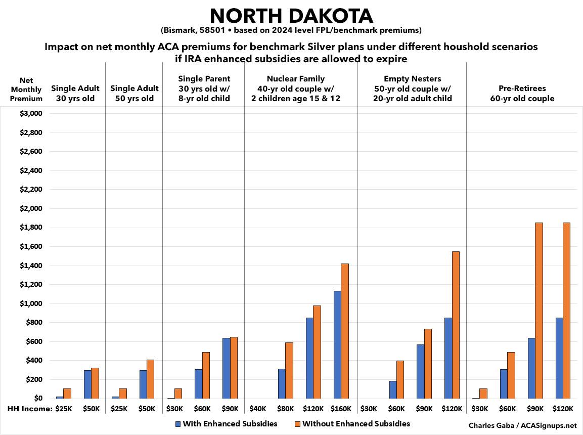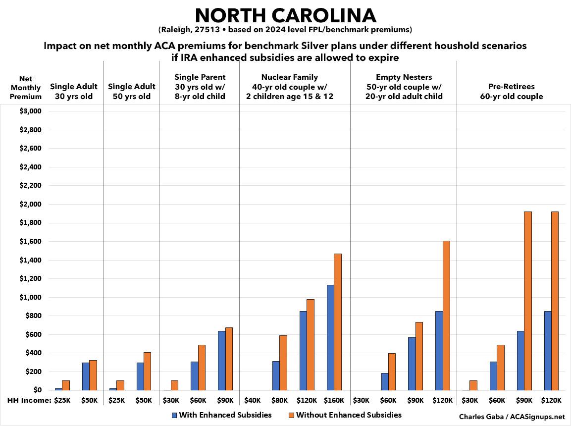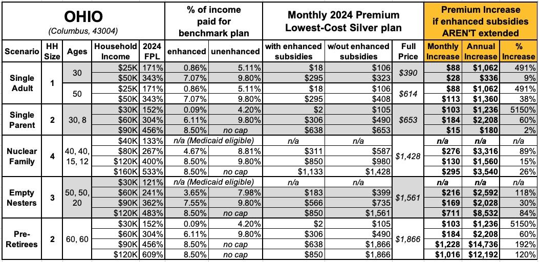 That's the macro level, however. As I did a couple of years ago when the subsidies were originally at risk of expiring in 2023, I decided to run the numbers myself to get an idea of just how much enrollees real-world health insurance premiums would go up in the event the ARPA/IRA subsidies are indeed allowed to expire at the end of next year.
