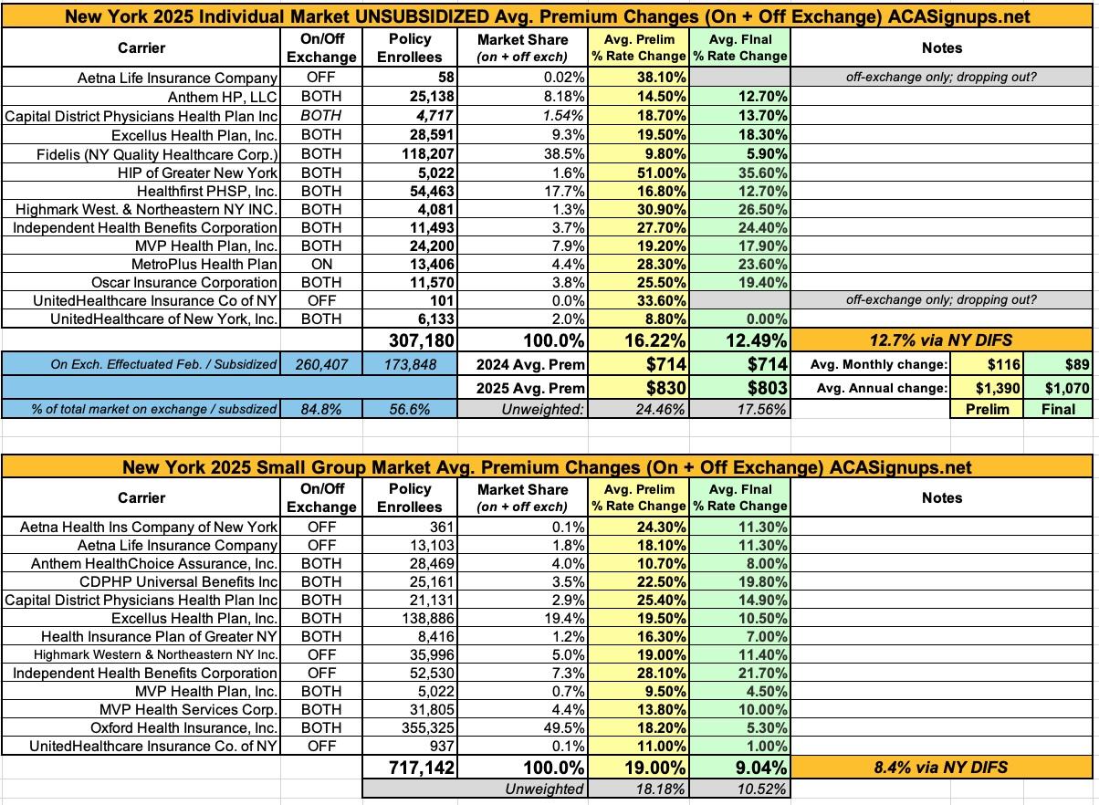 New York: *Final* avg. unsubsidized 2025 #ACA rate change: +12.7%; CSR expansion to 400% FPL confirmed!