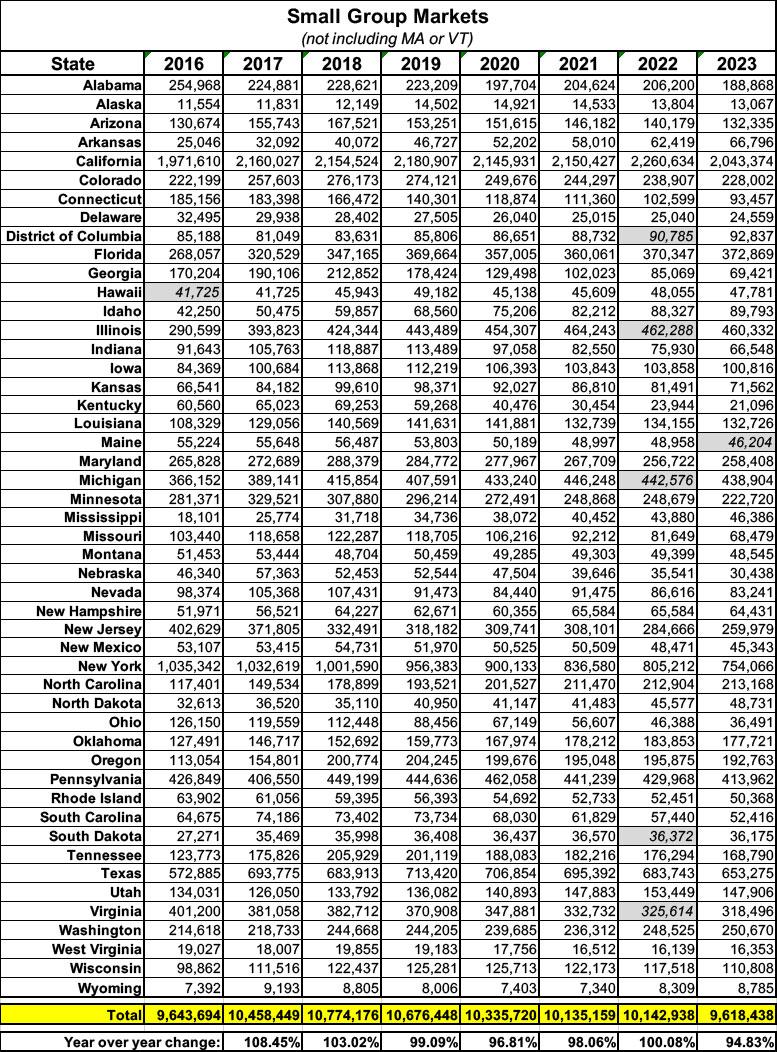 That's very much in line with this report from the Commonwealth Fund, which put the small group market a tad lower at 9.5 million in 2023.