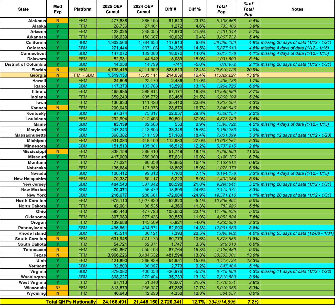 • FLORIDA continues to blow away every other state in raw enrollees, with over 4.7 MILLION residents having signed up so far...nearly 21% of their entire population, up over 520,000 vs. last year.