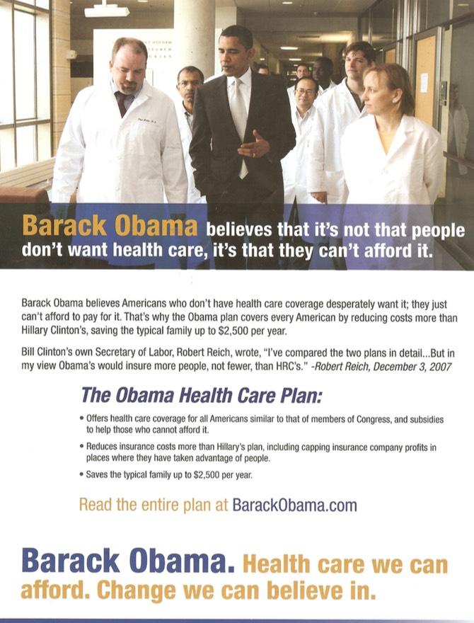 Shoutout to James Medlock for digging up this relic from the 2008 Presidential primariy race: A lit piece from then-Senator Barack Obama's campaign slamming then-Senator Hillary Clinton over her insistence on her proposed healthcare policy bill including an Individual Mandate Penalty. How many Republican talking points can you spot below?