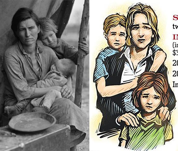 Notice how they’re MISERABLE as they stare wanly out at the reader, pleading for help. Yes, the single mother earning $260,000/year is obviously the direct descendant of the famous "Dust Bowl/Grapes of Wrath" mother from the famous Dorothea Lange photo.