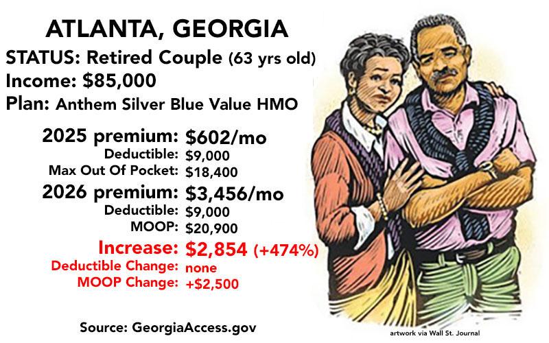 Again, in all of these cases the enrollees will likely shop around for a better value, but in most cases they'll just be trading off lower premiums (which will still usually be higher than they're paying now) for higher deductibles, co-pays and coinsurance...and in at least one case ​​​(the older couple in Atlanta), they're pretty much priced completely out of the individual market altogether...right when they're at an age where they absolutely can't afford NOT to have comprehensive health insurance.