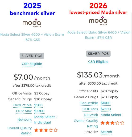 The good news is that in Boise, Idaho, Moda Health has 3 different Bronze plans which would cost her less than $25/month. The bad news is that, again, downgrading from Silver to Bronze means losing CSR assistance; her deductible would skyrocket to anywhere from $7,500 to $10,000.