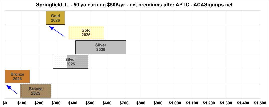 As I noted a couple of weeks ago, this is what Bronze, Silver and Gold plans are priced at for a single 50-yr old earning $50K/yr at full price in 2026 vs. 2025. At the time I noted how, thanks to Illinois newly-implementing Premium Alignment, Gold plans go from costing slightly more than Silver on average in 2025 to costing significantly LESS than Silver in 2026 even at full price.