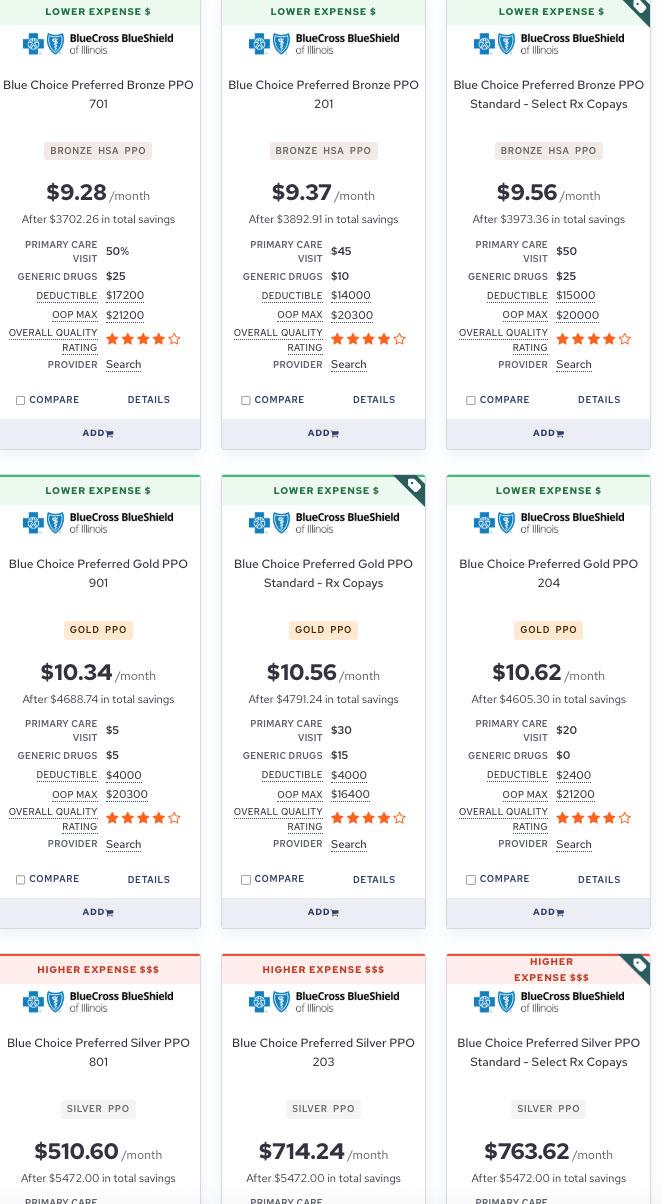 You'll also likely note that all 9 are from a single carrier (Blue Cross Blue Shield of IL) as well as that all 3 of the Gold plans cost less than $11/month while the three Silver plans cost between $500 - $764/mo.
