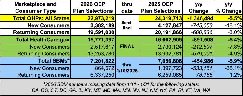 Total nationwide plan selections include 3.4 million consumers who are new to the Marketplaces for 2026, and 19.6 million consumers who had active 2025 coverage and selected a plan for 2026 coverage or were automatically re-enrolled. Open Enrollment on HealthCare.gov ran through January 15, 2026. State-based Exchange enrollment deadlines vary.