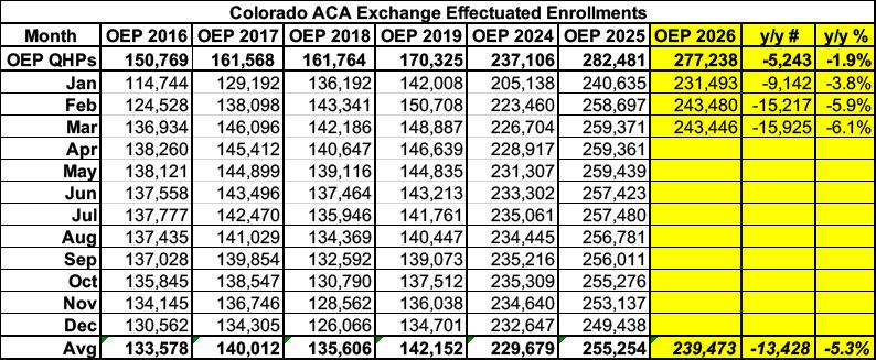 Connect for Health Colorado, the state's ACA exchange, has published effectuated enrollment data for January, February and March 2026, so it's time to dig in and see what this might say about national trends.