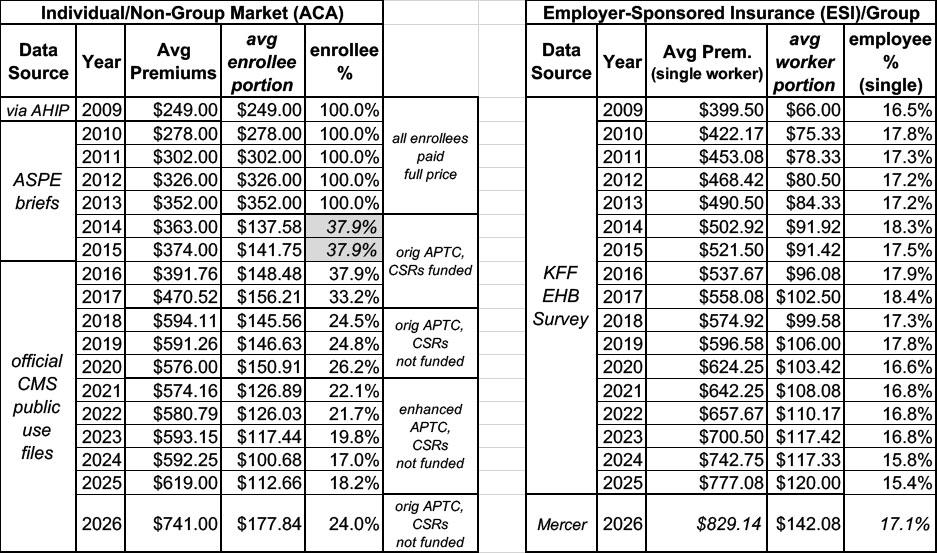 The bottom line is that the expiration of the enhanced tax credits means we're in a bit of an ironic situation: On average, gross individual market ACA policy premiums are still about ~10% lower than Employer-Sponsored insurance...but net ACA premiums (ie, what the enrollees actually pay) are now around 25% higher.