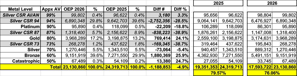 • For 2025 & 2026: CMS's Marketplace Open Enrollment Period Public Use Files, which include the same column but only for the initial Open Enrollment Period data (full-year averages, which will vary from these slightly, won't be available until at least July for 2025 and not until next year for 2026 for obvious reasons).