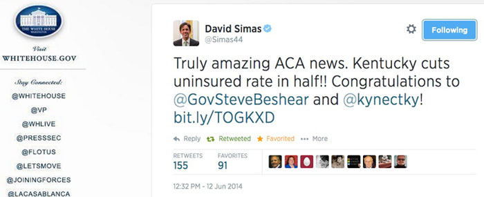 So, yesterday I posted an item about how the ACA has cut Kentucky's uninsured rate by at least 50% since last October. This is significant news, but I also posted similar items about impressive uninsured rate drops in New Jersey (38%), Minnesota (40%) and especially Massachusetts (a good 86% or so, down to nearly zilch). All four posts received various levels of retweets on Twitter. However, the Kentucky one in particular apparently caught the eye of one David Simas, aka the "Assistant to the President and Deputy Senior Advisor for Communications and Strategy."