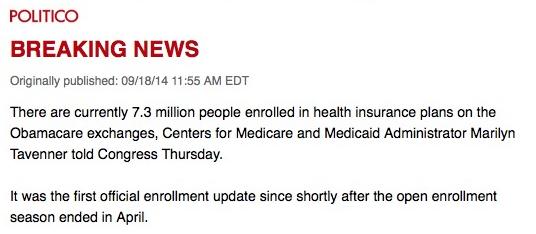 OK, I feel a bit silly posting this several days after HHS Sec. Burwell stated it officially, and it may seem especially anticlimactic given that I had already posted similar numbers from not one, not two, not three, not four, but five different respected national health insurance coverage surveys a couple of months ago (RAND Corp, Gallup, Urban Institute, Commonwealth Fund and the New England Journal of Medicine, to be precise), but it still seems like a good idea to lock this down for the record: