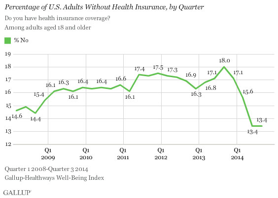 The uninsured rate for adults (Gallup doesn't survey kids under 18, of course), which hit a high of 18% last fall (just prior to the ACA exchanges launching) is holding steady at 13.4%, the same number it was at in the 2nd quarter of 2014: