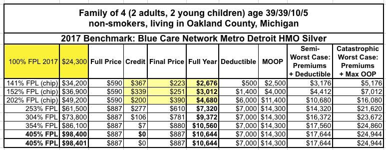 Let's suppose that you and your spouse were 39 years old last fall, and you have two young children. None of you smoke, and you live in Oakland County, Michigan. Let us further suppose that you decided to enroll your family in a standard Silver policy via the federal ACA exchange, HealthCare.Gov. Blue Cross Blue Shield of Michigan is the biggest carrier in the state, and Blue Care Network is their HMO division, so you decide to go with them.
