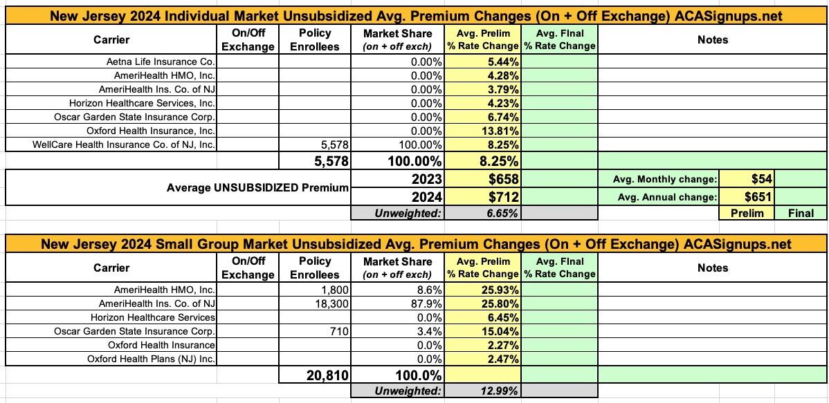 As is the case with far too many states these days, most of the rate filing memorandums are heavily redacted in New Jersey, making it nearly impossible to get ahold of the actual enrollment numbers, which means I have no way of running a weighted average on either market.