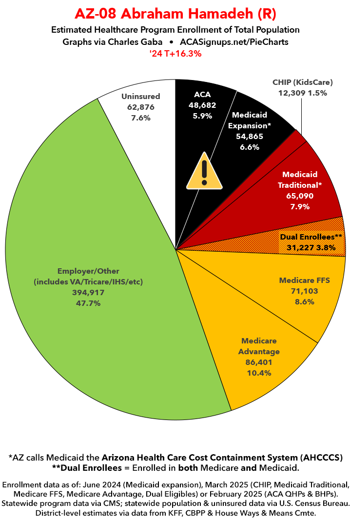 UPDATE 7/1/25: I've updated the web versions of the graphics with the most up-to-date enrollment data I have access to. The black sections w/the ⚠️ symbol are those most at risk of losing healthcare coverage due to H.R. 1, the "One Big Beautiful Bill Act" (aka the #MAGAMurderBill).