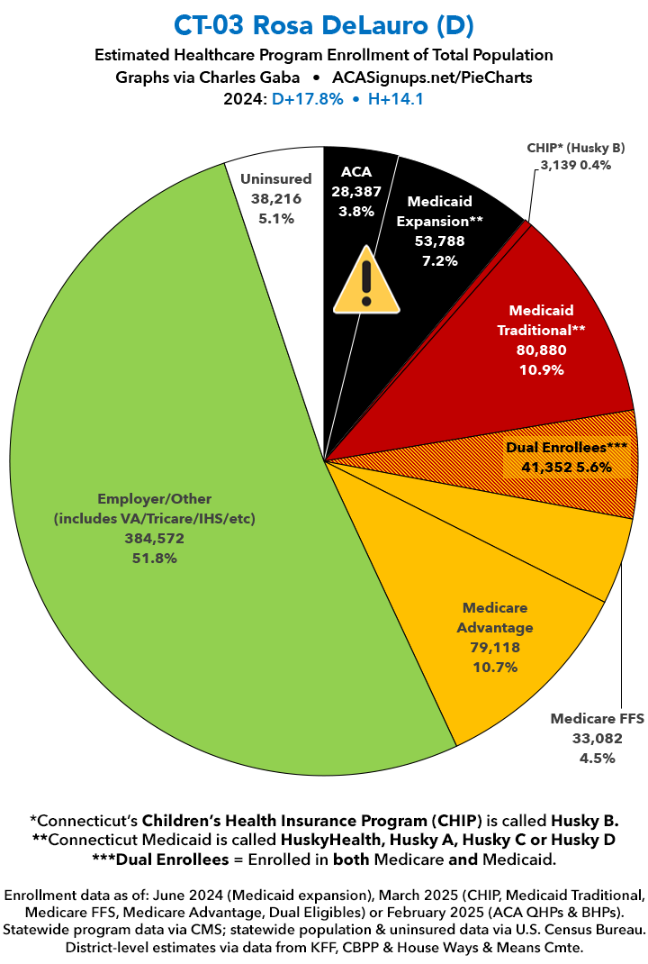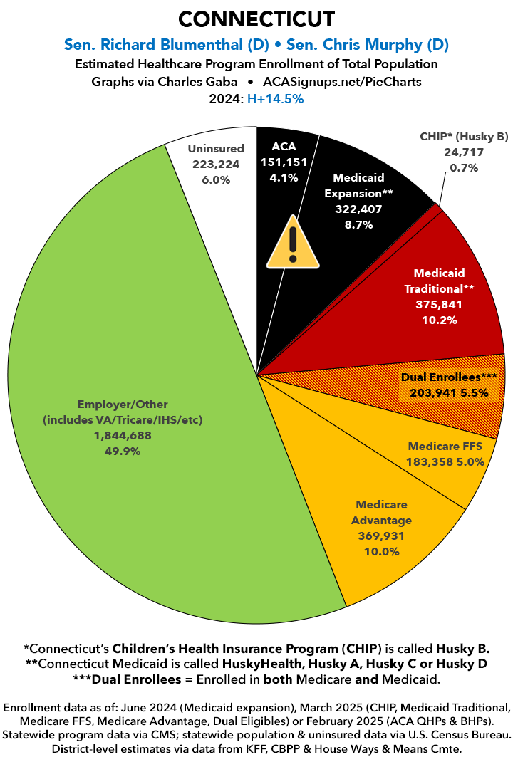 UPDATE 7/16/25: I've updated the web versions of the graphics with the most up-to-date enrollment data I have access to. The black sections w/the ⚠️ symbol are those most at risk of losing healthcare coverage due to H.R. 1, the "One Big Beautiful Bill Act" (aka the #MAGAMurderBill).​​​​​