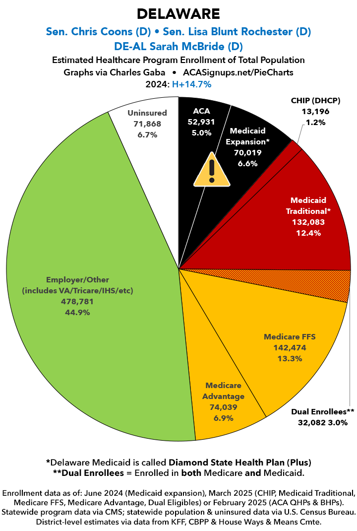 UPDATE 7/16/25: I've updated the web versions of the graphics with the most up-to-date enrollment data I have access to. The black sections w/the ⚠️ symbol are those most at risk of losing healthcare coverage due to H.R. 1, the "One Big Beautiful Bill Act" (aka the #MAGAMurderBill).