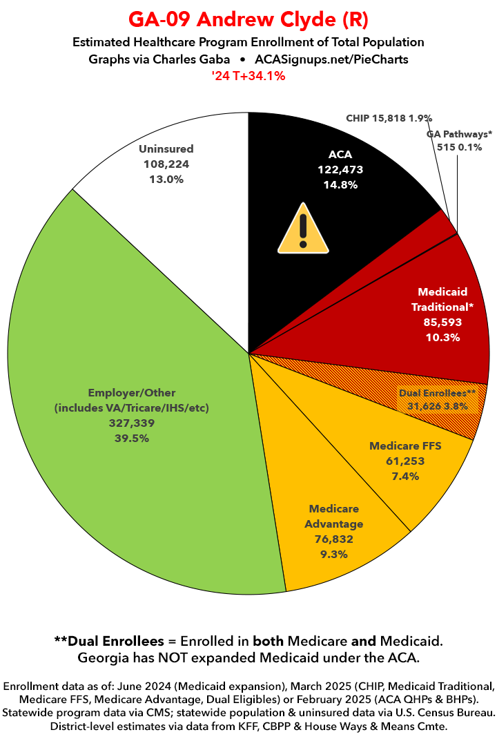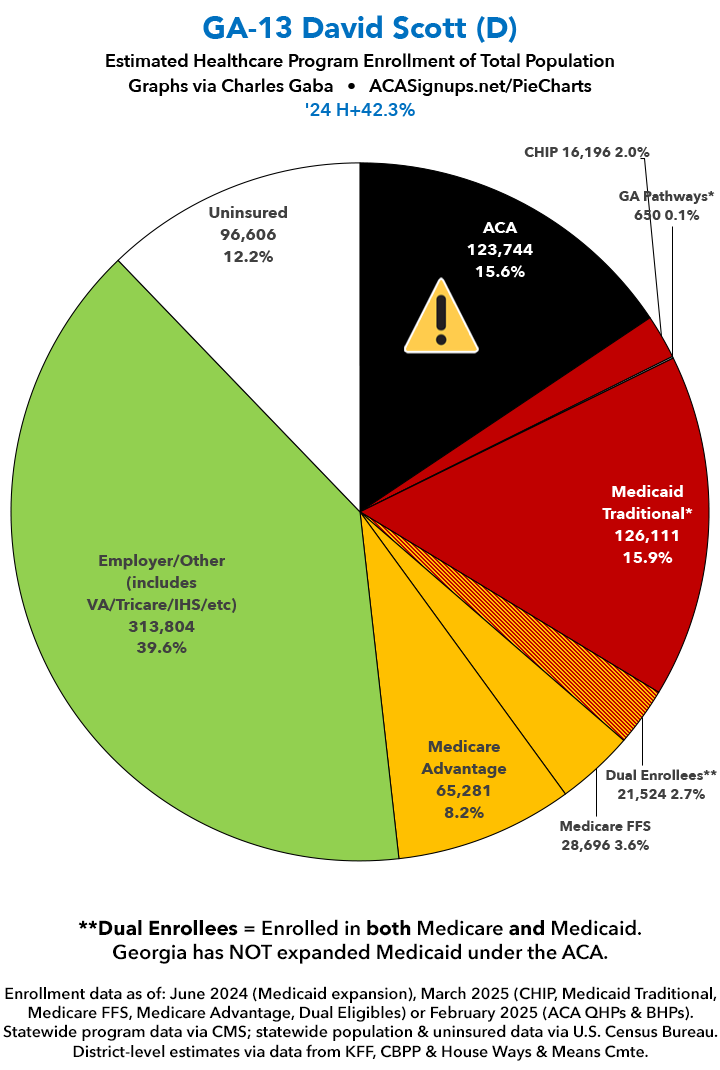 UPDATE 7/3/25: I've updated the web versions of the graphics with the most up-to-date enrollment data I have access to. The black sections w/the ⚠️ symbol are those most at risk of losing healthcare coverage due to H.R. 1, the "One Big Beautiful Bill Act" (aka the #MAGAMurderBill).
