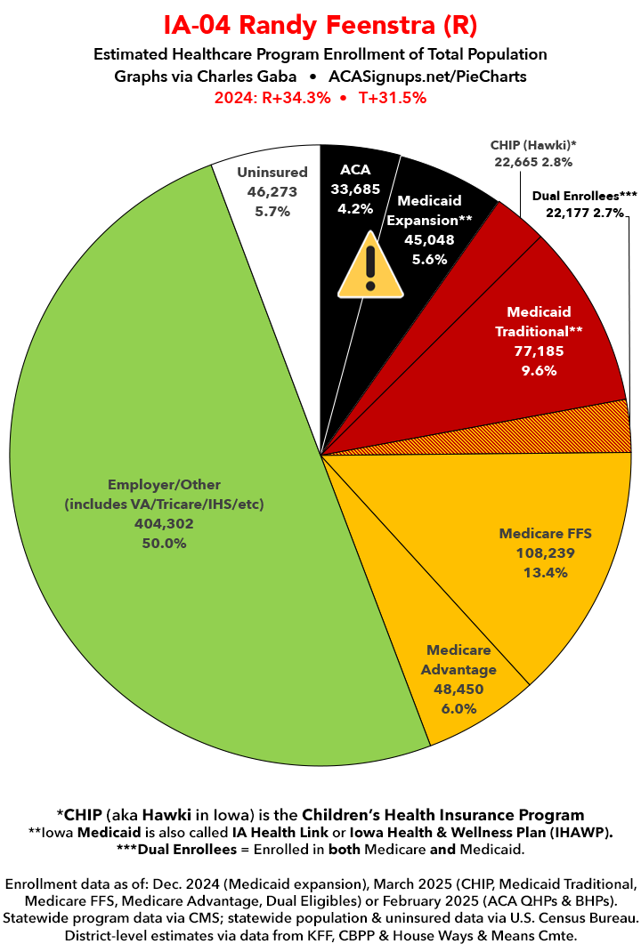 UPDATE 7/4/25: I've updated the web versions of the graphics with the most up-to-date enrollment data I have access to. The black sections w/the ⚠️ symbol are those most at risk of losing healthcare coverage due to H.R. 1, the "One Big Beautiful Bill Act" (aka the #MAGAMurderBill).