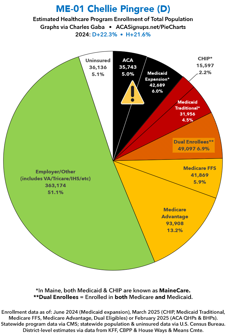 UPDATE 7/16/25: I've updated the web versions of the graphics with the most up-to-date enrollment data I have access to. The black sections w/the ⚠️ symbol are those most at risk of losing healthcare coverage due to H.R. 1, the "One Big Beautiful Bill Act" (aka the #MAGAMurderBill).