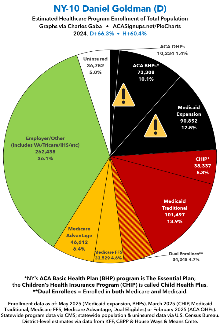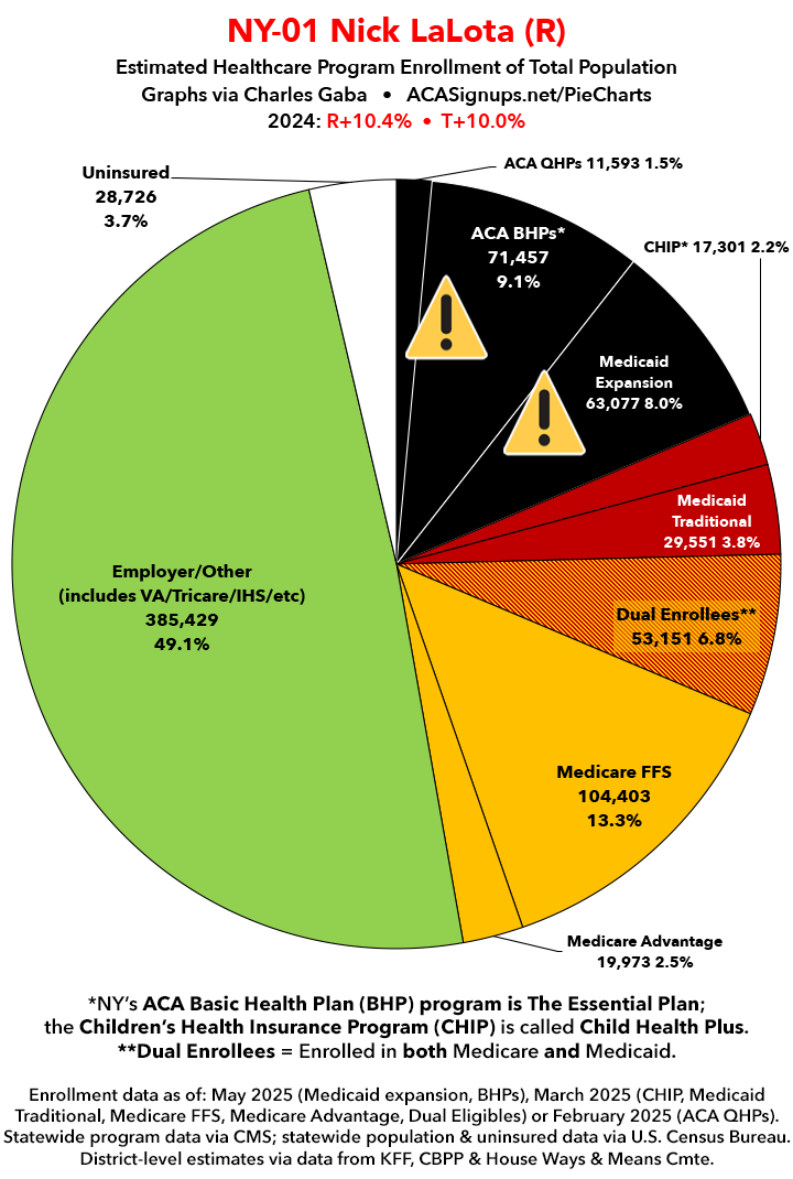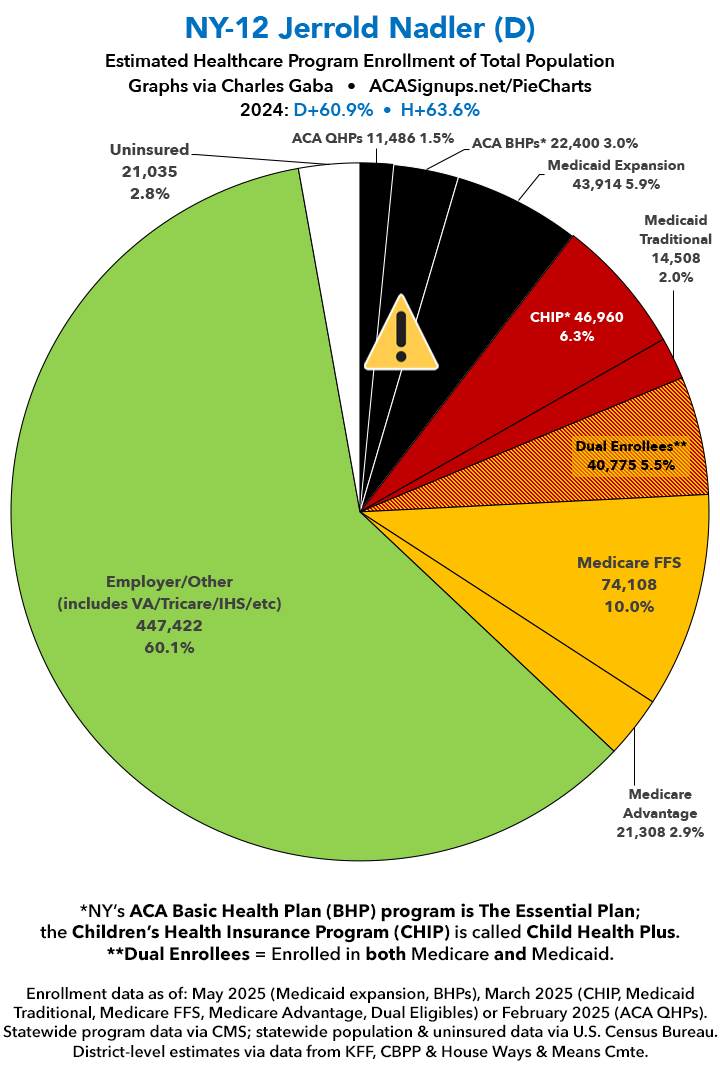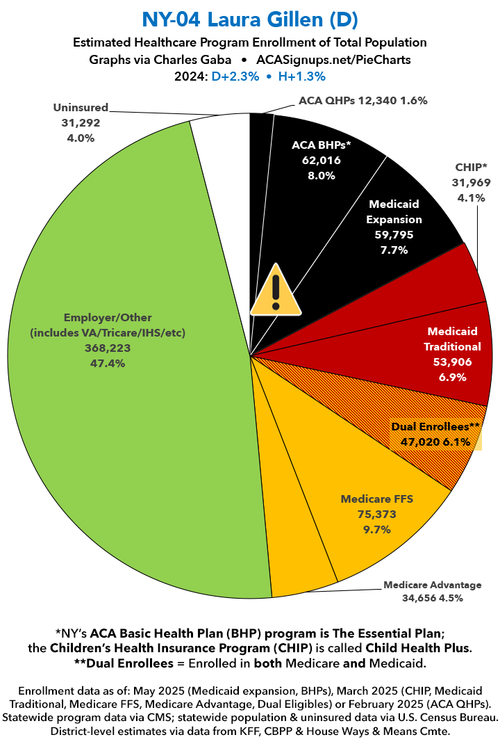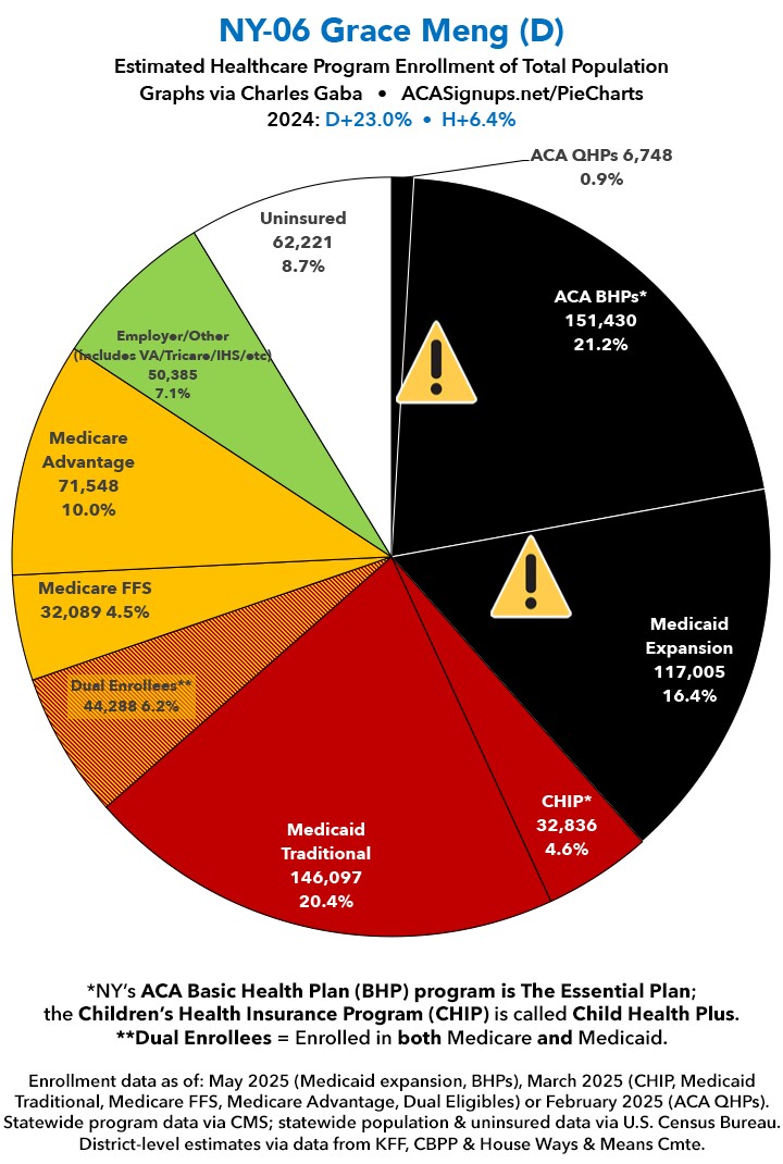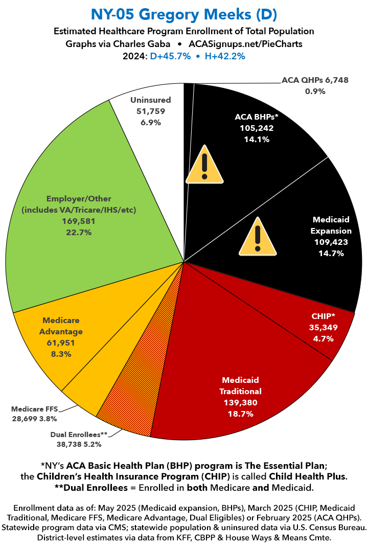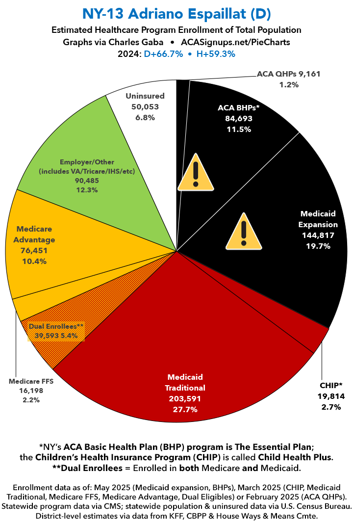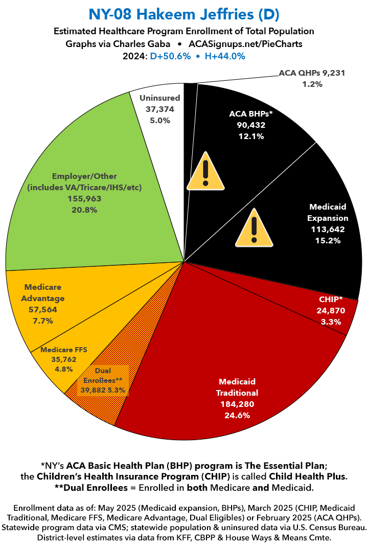 UPDATE 7/8/25: I've updated the web versions of the graphics with the most up-to-date enrollment data I have access to. The black sections w/the ⚠️ symbol are those most at risk of losing healthcare coverage due to H.R. 1, the "One Big Beautiful Bill Act" (aka the #MAGAMurderBill).