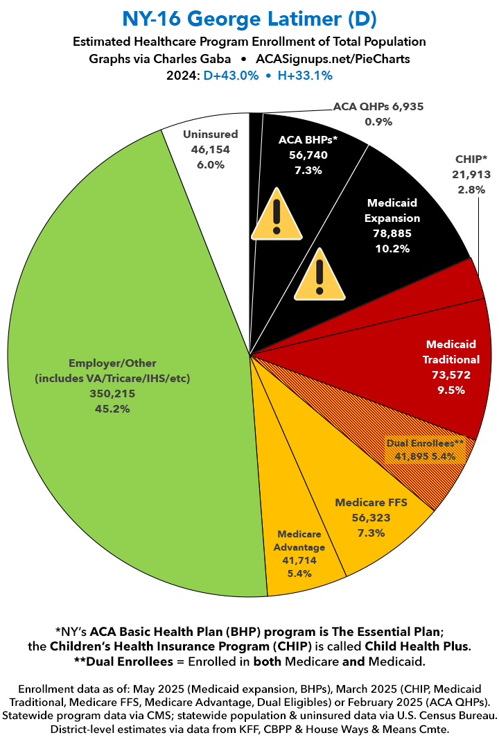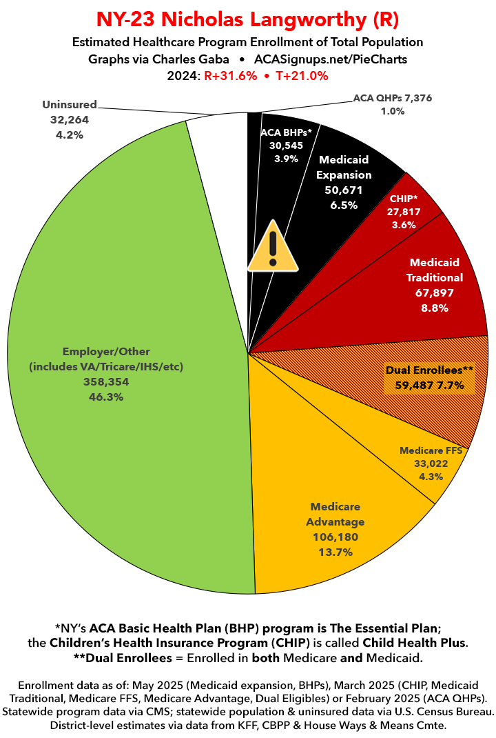 UPDATE 7/9/25: I've updated the web versions of the graphics with the most up-to-date enrollment data I have access to. The black sections w/the ⚠️ symbol are those most at risk of losing healthcare coverage due to H.R. 1, the "One Big Beautiful Bill Act" (aka the #MAGAMurderBill).