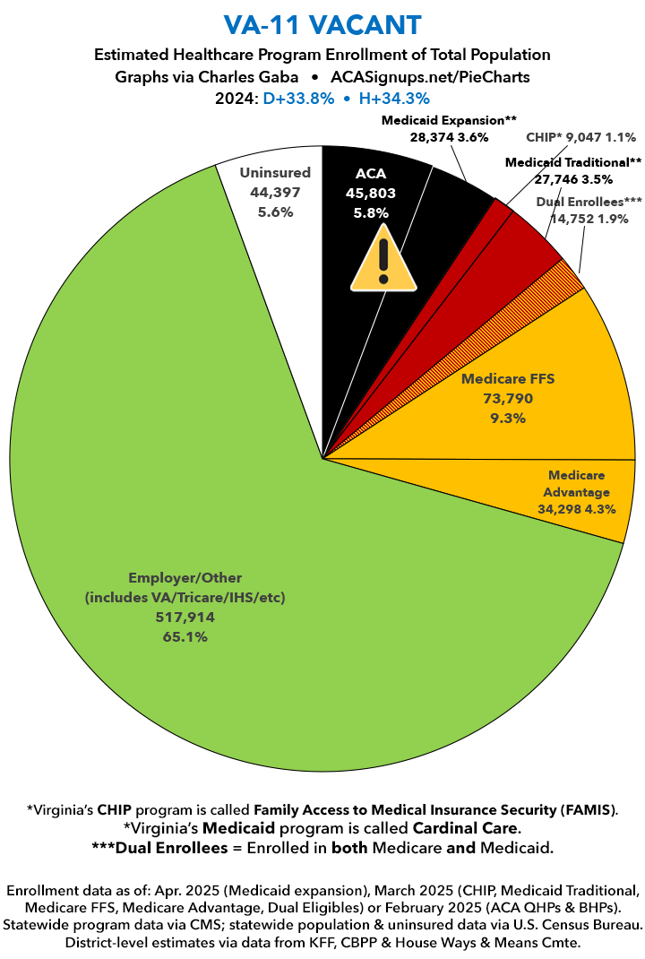 UPDATE 7/15/25: I've updated the web versions of the graphics with the most up-to-date enrollment data I have access to. The black sections w/the ⚠️ symbol are those most at risk of losing healthcare coverage due to H.R. 1, the "One Big Beautiful Bill Act" (aka the #MAGAMurderBill).