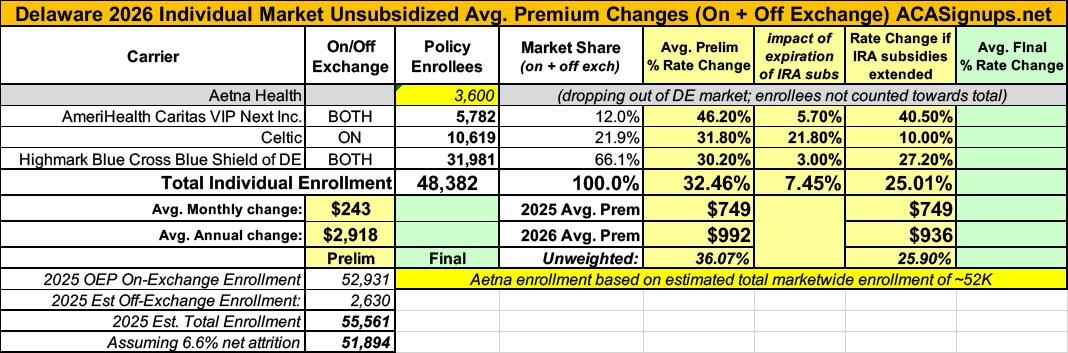 Delaware has ~53,000 residents enrolled in ACA exchange plans, 91% of whom are currently subsidized. They also have an unknown number enrolled in off-exchange plans. Overall, with net attrition, I estimate current total enrollment is down a bit to perhaps 52,000 today.
