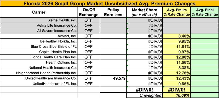 UPDATE 10/17/25: Oh for heaven's sake. It turns out that the Florida Office of Insurance Regulation (FLOIR) quietly published their final/approved 2026 rate filings for the individual market over two months ago and I didn't find out about it until now! A big shout-out to "techbud251" in the comments for alerting me to this PDF buried in the FLOIR website, with the final column labeled "Average % Change Approved."