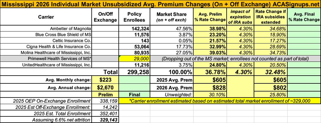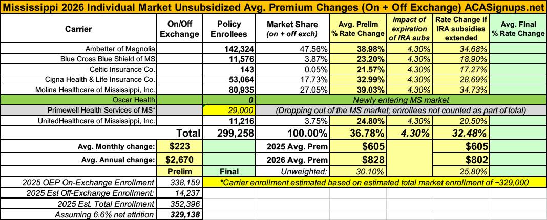 2026 Rate Changes - Mississippi: +36.8%; ~330,000 enrollees facing MASSIVE rate hikes starting in January