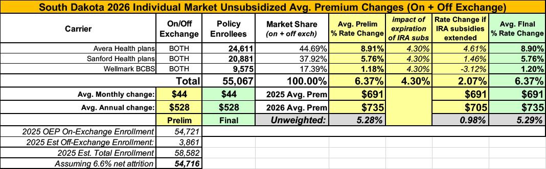 UPDATE 8/29/25: South Dakota's 3 individual market carriers have published their final/approved rate filings (see links below). All three were approved as is, but all of them also include the actual enrollment numbers, so I'm able to run a properly weighted average.