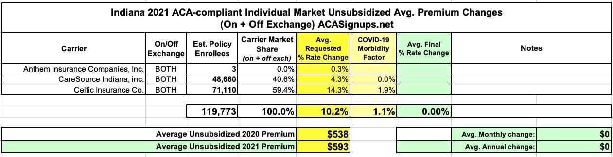 Back in early July, the Indiana Insurance Dept. posted the preliminary requested 2020 rate increases for the carriers participating in the ACA-compliant individual market. Technically there's three carriers there (CareSource Indiana, Celtic/Ambetter and Anthem), though Anthem only has 4 (yes, four) people enrolled in off-exchange policies total.