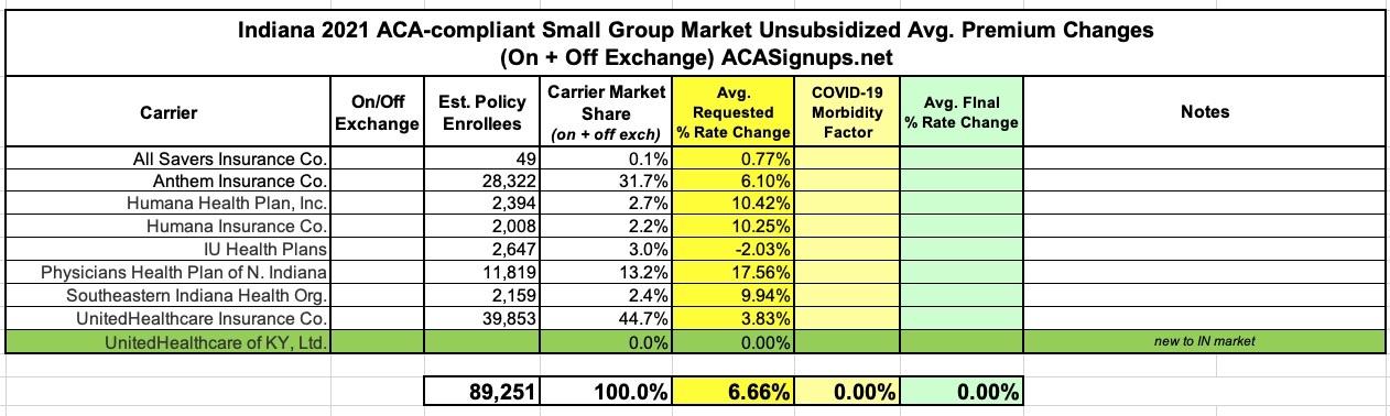 The Indiana Insurance Dept. has posted their 2021 individual & small group rate filings to the SERFF database. Nothing terribly noteworthy other than the average requested rate increase is unusually high for 2021 compared to most other states so far (10.2%, mainly via Celtic), and it looks like a second division of UnitedHealthcare is offering policies on the small group market next year: