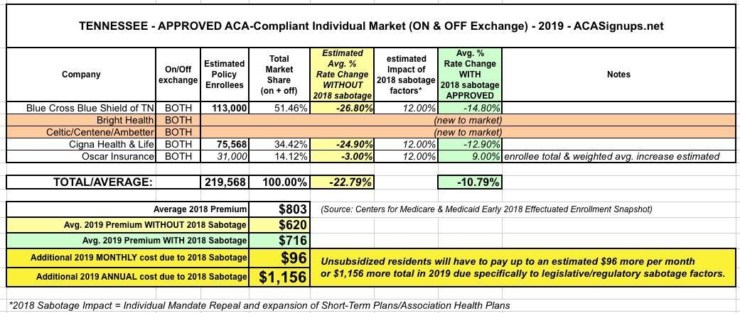 When I last posted about 2019 ACA-compliant individual market premium changes in Tennessee back in August, I noted that premiums statewide had gone from dropping 5.7% to dropping 10.8% on average after the Trump Administration first stated that they were going to unnecessarily "freeze" the ACA's Risk Adjustment fund transfers in response to a lawsuit ruling only to reverse themselves a week or so later and state that they were going to go ahead and process RA fund transfers after all.